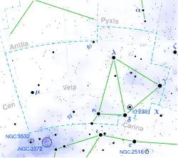 As constelações vizinhas são a Máquina Pneumática, a Bússola, a Popa, a Quilha e o Centauro. Nessa constelação está localizado o pulsar de Vela: uma estrela de nêutrons que está a cerca de oitocentos anos-luz da Terra e cujo período de rotação é de cerca de um décimo de segundo.[1]