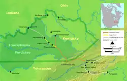 Em 1775, Daniel Boone abriu caminho para a Transylvania Company, da Virgínia, passando por Cumberland Gap, até o centro de Kentucky. Posteriormente, foi ampliado para chegar às Cataratas do Ohio, em Louisville. A Wilderness Road era íngreme e acidentada e só podia ser percorrida a pé ou a cavalo, mas era a melhor rota para milhares de colonos que se mudavam para o Kentucky.[52] Em algumas áreas eles tiveram que enfrentar ataques nativos. Só em 1784, os nativos mataram mais de 100 viajantes na Wilderness Road. Nessa época, o Kentucky estava despovoado - estava "vazio de aldeias indígenas".[53] No entanto, grupos de invasão às vezes apareciam. Um dos interceptados foi o avô de Abraham Lincoln, que foi escalpelado em 1784 perto de Louisville.[54]