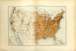 A motivação do lucro privado dominou o movimento para o oeste,[71] mas o governo federal desempenhou um papel de apoio na garantia da terra através de tratados e na criação de governos territoriais, com governadores nomeados pelo Presidente. O governo federal adquiriu primeiro o território ocidental através de tratados com outras nações ou tribos nativas. Em seguida, enviou topógrafos para mapear e documentar o terreno.[72] No século 20, as burocracias de Washington administravam as terras federais, como o Escritório Geral de Terras dos Estados Unidos no Departamento do Interior,[73] e depois de 1891, o Serviço Florestal no Departamento de Agricultura.[74] Depois de 1900, a construção de barragens e o controle de enchentes tornaram-se grandes preocupações.[75]