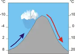 Um vento Föhn (ou Foehn) ocorre quando uma camada profunda de vento persistente é forçada a subir uma montanha. Ao subir a encosta, o ar se expande devido à diminuição da pressão atmosférica com a altitude e se resfria adiabaticamente, a ponto de atingir seu ponto de orvalho, condensando-se e ocasionalmente gerando precipitação.