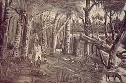 “Esta cachoeira não é tão elevada quanto a do Parahiba que tem bem quatro vezes a sua altura; estivemos acima desta cachoeira do Parahiba, mas não junto a ella, neste lugar descansamos um pouco e enviamos um negro que trazíamos comnosco com alguns índios, a bater o matto, os quaes trouxeram-nos seis grandes porcos do matto e um pequeno, mortos a flexa, depois proseguimos na marcha e acampamos junto a margem sul do rio S. Miguel. A 14 depois de havermos subido por algum tempo esse rio, passamos para a margem norte e uma milha adiante galgamos um elevado monte, de bem meia milha de altura, de cima do qual subimos ainda um outro monte, porem não tão alto; caminhando quasi sempre com rumo norte ou nordeste cerca de uma milha alem chegamos a um rio arenoso e secco, cheio de penhascos; marchando mais duas milhas passamos perto do lado occidental de uma cachoeira, não muito íngreme, mas presentemente sem água, no rio que afflue para o Parahiba; no dito rio acampamos chuvendo durante a noite”.[9]