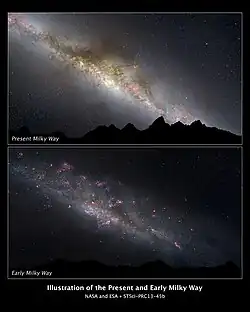 Ainda não há consenso sobre como ocorreu o processo que resultou na forma atual da Via Láctea. Nossa galáxia possivelmente começou a se originar há mais de treze bilhões de anos em dois sistemas estelares diferentes que então se fundiram: um era uma galáxia anã que chamamos de Gaia-Enceladus, e o outro era o principal progenitor de nossa galáxia, quatro vezes mais massivo e com uma maior proporção de metais quando iniciou o colapso da matéria que compunha o universo primordial. Há cerca de dez bilhões de anos houve uma violenta colisão entre o sistema mais massivo e Gaia-Enceladus. Como resultado, algumas de suas estrelas e as de Gaia-Enceladus foram colocadas em movimento caótico, e eventualmente formaram o halo da Via Láctea atual. A partir de pontos onde a densidade era relativamente maior, passaram a surgir os primeiros grupos de estrelas que, por sua vez, formaram os aglomerados globulares situados no halo que, de fato, são os componentes mais antigos remanescentes até os dias atuais. No mesmo período, começou a se formar o bojo central, ao redor do qual os aglomerados globulares orbitavam. Depois disso, houve explosões violentas de formação estelar até 6 mil milhões de anos atrás, quando o gás se instalou no disco da Galáxia e produziu o que conhecemos como o "disco fino".[2] Tal processo pode ter levado alguns bilhões de anos.[3]