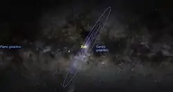 O Sol descreve uma órbita ao redor do centro galáctico com velocidade de cerca de 220 quilômetros por segundo, o que resulta em um período orbital de aproximadamente 225 milhões de anos. Desde sua formação, estima-se que o Sol tenha completado seu trajeto vinte vezes. O vetor velocidade do Sol aponta para a constelação de Cisne. Em relação ao referencial de repouso local, ou seja, desconsiderando-se o movimento do Sol e de todas as outras estrelas ao redor do centro galáctico, o Sol se move a 22 quilômetros por segundo na direção da constelação de Hércules, em direção a um ponto denominado ápice solar. O Sol apresenta, ainda, um movimento de oscilação harmônico em relação ao plano galáctico, cruzando-o com um período entre 52 a 74 milhões de anos, com amplitude máxima entre 49 a 93 parsecs acima ou abaixo do plano galáctico. Atualmente estamos a cerca de 15 parsecs acima do plano da Via Láctea.[82][83] O período destas oscilações da órbita solar aproximadamente coincidem com eventos de extinção em massa, levantando suspeitas de que, ao cruzar regiões densas de nuvens moleculares ou dos braços espirais, perturbações gravitacionais modificariam a órbita de cometas distantes do Sistema Solar que, por sua vez, atingiam nosso planeta.[84]