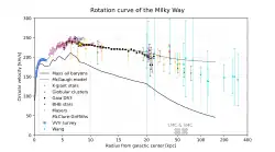 A curva de rotação descreve a velocidade de rotação dos astros da galáxia em função de sua distância ao centro. Esta velocidade está diretamente relacionada à quantidade de matéria que se encontra no interior desta órbita, sendo possível, portanto, inferir a massa da galáxia por meio do movimento de seus componentes. Conforme revela a curva de rotação da Via Láctea, a velocidade em suas partes externas é maior do que o esperado, o que implica uma grande quantidade de matéria existir além do disco, muito além do que pode ser observado. Por isso, acredita-se que a anomalia seja provocada pela matéria escura, indetectável diretamente e cuja natureza se desconhece.[81]
