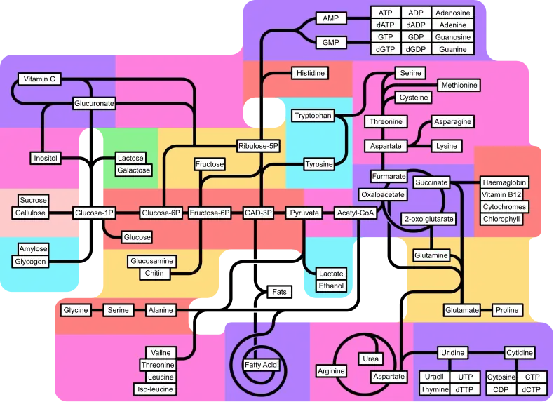 Principais vias metabólicas em um mapa topológico. Clique em qualquer texto (nome da via ou de metabólitos) para aceder ao artigo correspondente. Linhas simples: vias comuns à maioria das formas de vida. Linhas duplas: vias não presentes em humanos (ocorrem, por exemplo, em plantas, fungos, procariotas). |