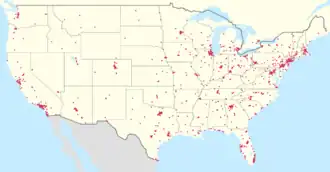 Mapa, de agosto de 2011, mostrando as cidades norte-americanas nas quais a empresa atua