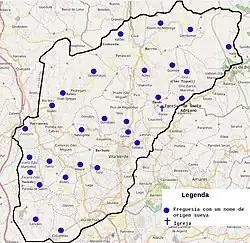 - ↑ Almeida Fernandes. Paróquias suevas e dioceses visigóticas , Arouca 1997 p. 152 (Aboim, Arcozelo, Ataẽs, Atiães, Azões, Cabanelas, Cervães, Escariz – São Mamede, Escariz - S. Martinho, Freiriz, Gême, Goães, Gondiães, Gomide, Godinhaços, Gondomar, Moure, Nevogilde. Oriz – Santa Marinha, Oriz - São Miguel, Parada de Gatim, Sabariz, Sande, Turiz, Valdreu, Valões)
