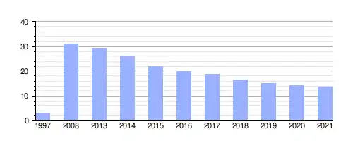 Referências: 1997 e 2008,[29] 2013–2018,[28] 2019[30] 2019–2021[28]