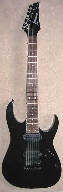 O primeiro modelo de guitarra de sete cordas de corpo sólido produzido em massa foi o Ibanez UV7 como um modelo de assinatura para o guitarrista virtuoso Steve Vai. Vai foi atraído para a ideia por muitas das mesmas razões que os músicos clássicos e de jazz de sete cordas foram - o alcance estendido que a corda adicional oferecia. Após a experimentação inicial com um A alto, um baixo B foi adicionado como o alto A provou ser muito propenso a quebrar. Vai começou a turnê com o Whitesnake com um protótipo de sete cordas, e depois usou as guitarras para seu lançamento em 1990 Passion & Warfare.