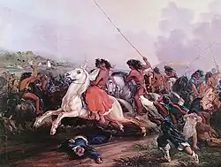 A pintura retrata uma mulher chilena sendo sequestrada durante um malón. O sequestro de noivas para fins de casamento forçado e gravidez forçada foi comum durante a história em muitos países.