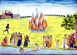 Cerimônia Sati (uma prática hindu pela qual uma viúva se imola na pira funerária de seu marido).