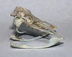 Crânio de serpente do gênero Crotalus, pode-se observar facilmente as grandes presas utilizadas na injeção do veneno (dentição solenóglifa).