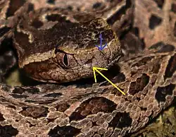 Bothrops jararacussu, com setas indicando a posição da fosseta loreal (em amarelo) e narinas (em azul).