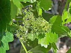 Suas flores, pequenas e esverdeadas a brancas, são agrupadas em inflorescências e seus frutos, de diferentes formas dependendo da subespécie, são bagas agrupadas em cachos. O cálice é unifoliado com cinco dentes curtos e decíduos. A corola consiste em cinco pétalas, fundidas no topo e na base, e depois cai inteira. Opostas às pétalas, há cinco estames intercalados com glândulas. O ovário superior possui um estilete muito curto com um estigma em forma de botão. A videira silvestre é uma planta dióica, as flores masculinas e femininas surgem em plantas diferentes, mas as formas cultivadas são hermafroditas, permitindo a autopolinização.[22][23]