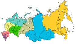 A política interna de Putin, principalmente durante seu primeiro mandato, visou a criação de um "poder vertical". Em 13 de maio de 2000, sancionou um decreto dividindo as 89 subdivisões da Rússia entre 7 distritos comandado por representantes nomeados por si mesmo, de forma a facilitar a administração federal. Putin também desenvolveu uma política de crescimento das subdivisões: o número caiu de 89 em 2000 para os atuais 83, após a fusão dos okrugs com demais subdivisões próximas.
