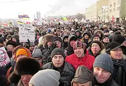 Após as eleições parlamentares de dezembro, dezenas de milhares de russos juntaram-se a protestos contra alegadas fraudes eleitorais,[45][46] naqueles que foram os maiores protestos desde que Putin tornou-se figura principal na política russa. Putin comparou os manifestantes aos macacos das histórias de Rudyard Kipling.[47] Os participantes do protesto criticaram Putin e o Rússia Unida, exigindo a anulação dos resultados das eleições. Segundo a imprensa russa, esses protestos, que foram organizados por líderes da oposição, suscitaram o medo de uma revolução colorida na sociedade, e diversos contraprotestos foram liderados por simpatizantes e partidários de Putin, superando os protestos da oposição.[48][49][50] Por ironia, a socialite Ksenia Sobchak, filha do padrinho político de Putin, Anatoli Sobchak, foi uma das celebridades que mais fortemente criticaram o governo de Putin nos protestos do final de 2011, manifestando sua indignação com seu terceiro mandato no dia de sua posse.[51]