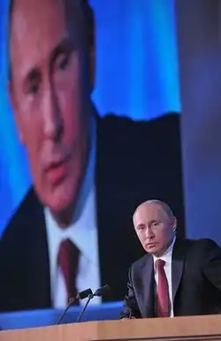 Em março de 2014, motivado pela crise política na Ucrânia, Putin enviou ao Soviete da Federação a proposta de uma intervenção militar na Crimeia, região de maioria russa, após apelo do primeiro-ministro. A proposta foi aceita pelo órgão superior, desagradando às autoridades ocidentais, que condenaram o ato, levando o presidente norte-americano, Barack Obama, a afirmar que "qualquer violação da integridade territorial e soberania da Ucrânia seria profundamente desestabilizadora, e representaria uma séria interferência em matérias que devem ser decididas pela população ucraniana".[63] Para Putin, a intervenção foi a fim de proteger os cidadãos russos que compõem a maioria étnica da Crimeia, que se havia declarado independente antes de qualquer movimentação militar russa, devido à alegada perseguição da população russa por parte do governo extremista e nacionalista que havia tomado posse na Ucrânia. Putin declarou apoio aos separatistas russos das regiões de Donetsk e Lugansk, também regiões de maioria russa.[64][65] O povo da Crimeia festejou[66] o resultado do referendo, que se tornou polêmico devido ao fato da OTAN, o governo ucraniano e os EUA não terem aceitado o resultado, afirmando que havia sido feito de forma ilegal.[67]