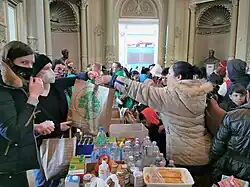 Na sequência da Guerra Russo-Ucraniana, em fevereiro de 2022, ordenou a invasão da Ucrânia, questionando seu direito de existir como país independente.[73] A invasão foi amplamente condenada pela comunidade internacional, e países membros da União Europeia e da OTAN lançaram uma nova rodada de sanções contra a Rússia, o que começou a desencadear uma crise financeira no país.[74] De acordo com o Alto-comissariado das Nações Unidas para os Refugiados, em decorrência da guerra, quase três milhões de ucranianos fugiram do seu país até a segunda semana de março, em sua grande maioria mulheres e crianças. Cerca de um milhão e meio de pessoas tiveram de abandonar suas casas mas permaneciam no país, e cerca de doze milhões estavam carentes de assistência.[75] Em muitos países foram organizados protestos populares contra o ataque, enquanto que os protestos que aconteceram na Rússia foram reprimidos com prisões em massa.[76] Segundo a Anistia Internacional, o governo russo passou a perseguir dissidentes e impôs censura à imprensa, obrigando os veículos de informação domésticos a divulgarem apenas versões do conflito aprovadas pelo governo,[77] além de limitar ou bloquear o acesso dos cidadãos russos a veículos estrangeiros.[78]