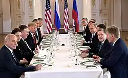 - ↑ Greenberg, Jon (19 de fevereiro de 2018). «Donald Trump falsely says he never denied Russian meddling» (em inglês). PolitiFact. Consultado em 11 de junho de 2019