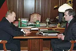 Em 16 de agosto de 1999, a Duma Estatal aprovou a nomeação de Vladimir Putin como Primeiro-Ministro da Rússia com 233 votos (vs. 84 contra, 17 abstenções).[20] Putin na época era praticamente desconhecido do público em geral, e não se esperava que durasse mais do que seus predecessores. Ele foi inicialmente considerado um leal a Yeltsin; como outros primeiros-ministros de Boris Yeltsin, Putin não escolhia os próprios ministros, seu gabinete era determinado pela administração presidencial.[21]
