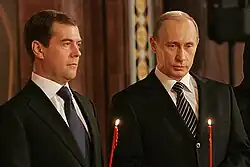 A constituição russa não permite um terceiro mandato, portanto Putin não pôde disputar as eleições de 2008. Em 8 de maio, no dia seguinte às eleições, consideradas por observadores ocidentais "nem justas nem livres", Dmitri Medvedev, o presidente eleito, escolheu Putin como seu primeiro-ministro, de modo a manter o seu poder político.