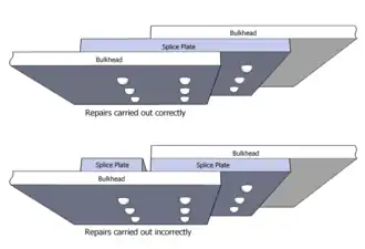 - 2. O reparo subsequente do anteparo não estava em conformidade com os métodos de reparo aprovados pela Boeing. Para reforçar um anteparo danificado, o procedimento de reparo da Boeing exige uma placa de emenda contínua com três fileiras de rebites.[23] No entanto, os técnicos da Boeing que executavam o reparo usaram duas placas de emenda paralelas à rachadura por estresse.[24][25] Cortar a placa dessa maneira enfraqueceu a eficácia de uma das fileiras de rebites, reduzindo a resistência da peça à fissura por fadiga para cerca de 70% da mesma para um reparo correto. Durante a investigação, a Comissão de Investigação de Acidentes calculou que esta instalação incorreta falharia após aproximadamente 10 000 ciclos de pressurização, e a aeronave realizou 12 318 voos bem-sucedidos a partir do momento em que o reparo defeituoso foi feito quando o acidente ocorreu.[4]