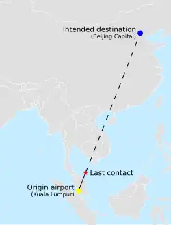 O voo MH370 partiu de Kuala Lumpur à 0h41 (UTC+8). Sua chegada era esperada em Pequim às 6h30 do mesmo dia 8.[nota 2]