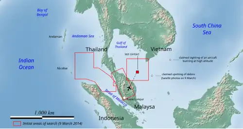 A China divulgou imagens de satélite, captadas no dia 9, indicando possíveis destroços do avião no Golfo da Tailândia, ao sul do Vietname. As fotos mostravam três objetos flutuantes não muito distantes da rota original do voo, cujo tamanho foi estimado em 13 por 18 metros, 14 por 19 metros e 24 por 22 metros.[33] Tais informações, no entanto, acabaram sendo refutadas pelo ministro dos transportes malaio Hishammuddin Hussein, que disse se tratar de um engano da China.[37]
