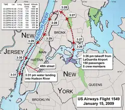 - 1 2 «Timeline of flight that landed in Hudson River». San Francisco Chronicle (em inglês). Associated Press. 17 de janeiro de 2009. Consultado em 12 de fevereiro de 2009
