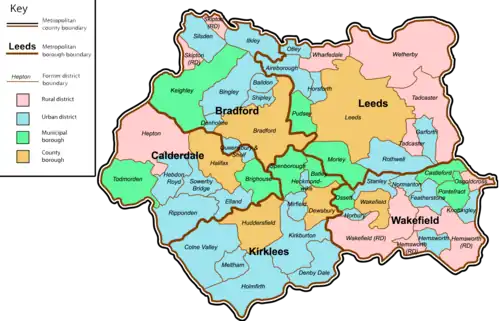 O município teve inicialmente uma estrutura de dois níveis de governo local com um conselho do condado de nível estratégico e cinco distritos fornecendo a maioria dos serviços.[6] Em 1986, os conselhos municipais metropolitanos foram abolidos em toda a Inglaterra. As funções destes conselhos foram transferidas para os municípios; Comitês conjuntos que cobrem bombeiros, polícia e transportes públicos, e outros acordos conjuntos especiais.[7] Organizações como West Yorkshire Police Authority (Autoridade Policial de West Yorkshire) e West Yorkshire Passenger Transport Executive (Transporte Executivo de Passageiros de West Yorkshire) continuam operando nestas bases.