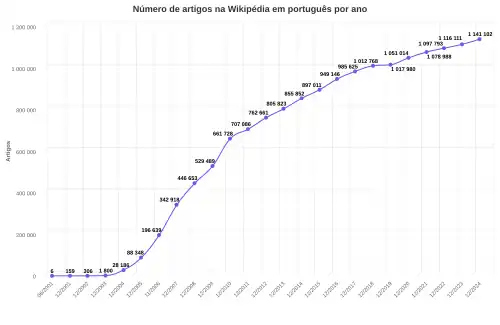 Em outubro de 2007, a Wikipédia lusófona ultrapassou a marca dos 300 mil artigos. Em junho de 2008 ultrapassou a marca dos 400 mil artigos, e em 13 de agosto de 2009 ultrapassou a marca dos 500 mil artigos.