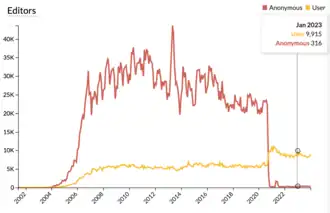 A 4 de outubro de 2020, a Wikipédia lusófona aprovou a restrição de edição de verbetes a editores registados, com o objetivo principal de prevenir o vandalismo,[9][10] tornando-se a primeira Wikipédia a aplicar essa restrição.[11]