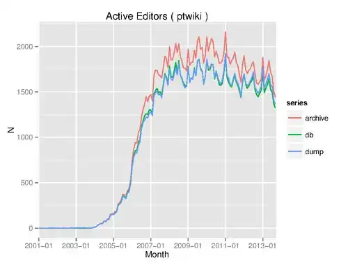 Gráfico do número de wikipedistas por mês na Wikipédia portuguesa.