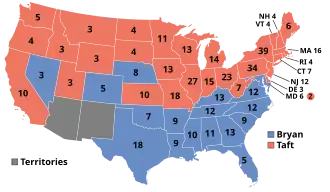 Taft enfrentou pouca oposição para garantir a indicação Republicana a presidente em 1908, facilmente derrotando William Jennings Bryan, o candidato do Partido Democrata, na eleição. Na Casa Branca ele focou-se mais na Ásia Oriental do que na Europa e também repetidamente interveio para estabelecer ou remover governos em países latino-americanos. Taft procurou reduzir impostos de comércio, então uma grande fonte de renda governamental, porém o projeto de lei resultante foi muito influenciado por interesses especiais. Seu governo estava cheio de conflitos entre a ala conservadora, da qual Taft frequentemente simpatizava, e a ala progressista, da qual Roosevelt se aproximava cada vez mais. Controvérsias dentro da administração separaram mais os dois homens. O ex-presidente desafiou seu sucessor para renomeação em 1912, porém este usou seu controle do maquinário partidário para ganhar a maioria dos delegados. Roosevelt deixou o partido e Taft ficou com poucas chances de reeleição.