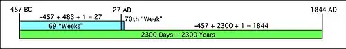 Hoje variadas denominações são resultantes da hermenêutica de William Miller. Para os adventistas do Sétimo Dia, Ellen White considerou que o evento de 1844 se tratava do juízo investigativo, ao qual, Jesus entrou no santuário celestial para purificar,[25][26][27][28][29] resultando nos movimentos millerita e adventista. Já os Baha'is consideram a profecia de Miller como precisa, mas sendo referente à emergência do movimento Baha'i.[30]