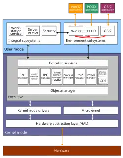 A arquitetura da família do sistema operacional Windows NT consiste em duas camadas (modo de usuário e modo kernel), com muitos módulos diferentes dentro dessas duas camadas.