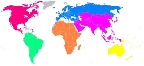 Mapa-múndi com as seis associações de área indicadas.