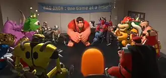 ..Wreck-It Ralph contém uma série referências aos jogos de vídeo. Na reunião dos vilões anônimos, inclui os personagens já citados acima, além de outros que não tem fala, como: Bowser de Super Mario Bros.,[12] Doutor Eggman de Sonic the Hedgehog,[13][14] e Neff de Altered Beast.[15]