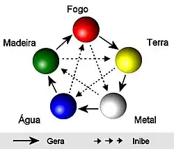 A relação das cinco fases/elementos são: a madeira produz o fogo; o fogo produz a terra; a terra produz o metal; o metal produz a água, e; a água produz a madeira.[7]