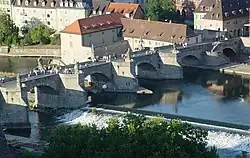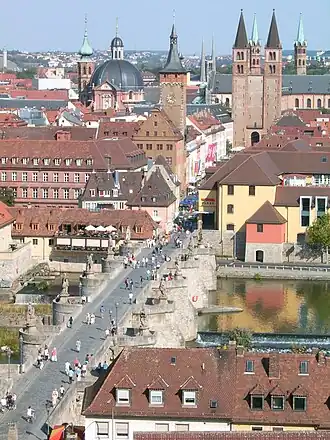 ![]() Centro histórico com a ponte antiga, a prefeitura e a catedral visto da fortaleza de Marienberg | |