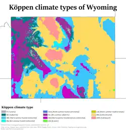 O clima, geralmente, em Wyoming é semiárido e continental, sendo que é mais seco e ventoso, em comparação com os outros estados dos Estados Unidos, com extremos de temperatura que podem chegar a 31 °C. Durante o verão, as temperaturas médias elevadas em julho chegam a 29 °C na maior parte do estado. Com o aumento da altitude, porém, essa média cai rapidamente com locais acima de 2 700 m, sendo que é a média em torno 21 °C. Na maior parte do estado, a maioria de precipitação de chuva tende a ser na primavera e início de verão. Wyoming é um estado seco, com grande parte das terras que recebem menos de 250 mm de chuva por ano.