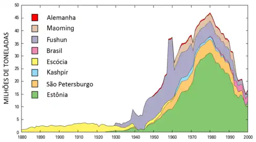 - ↑ Yin, Liang (7 de novembro de 2006). Current status of oil shale industry in Fushun, China (PDF). International Oil Shale Conference. Amman, Jordan. Consultado em 29 de junho de 2007
