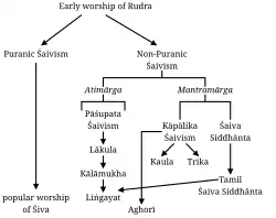 - Não purânico. Estas são subtradições esotéricas minoritárias, nas quais os devotos são iniciados (dīkṣa) em um culto específico de sua preferência. Seus objetivos variam, indo desde a libertação na vida atual (mukti) até a busca de prazeres em mundos superiores (bhukti). Seus meios também variam, abrangendo desde o atimarga meditativo ou "caminho superior externo" versus aqueles cujos meios são mantras orientados pela recitação. As subtradições atimargas incluem as de Pashupata e Lakula. De acordo com Sanderson, os paxupatas[nota 5] têm a herança mais antiga, provavelmente do século II d.C., como evidenciado por antigos textos hindus, como o livro Shanti Parva do épico Mahabharata.[103][100] A subtradição tântrica nesta categoria pode ser rastreada pós século VIII até depois do século XI, dependendo da região do subcontinente indiano, paralelamente ao desenvolvimento das tradições do Tantra budistas e jainistas neste período.[104] Entre estas estão as dualísticas Shaiva Siddhanta e xaivas de Bhairava (não saidânticas), com base no fato de elas reconhecerem algum valor na ortopraxia védica.[105] Essas subtradições prezam o sigilo, fórmulas simbólicas especiais, iniciação por um professor e a busca de siddhi (poderes especiais). Algumas dessas tradições também incorporam ideias teístas, elaborados iantras geométricos com significado espiritual incorporado, mantras e rituais.[104][106][107]