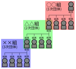 A estrutura das organizações yakuza é caracterizada por uma estrutura hierárquica de múltiplas camadas. O kobun (pseudo-filho) de uma organização torna-se oyabun (chefe da família e pseudo-pai) e administra suas próprias organizações subsidiárias, e o kobun das organizações subsidiárias também se torna oyabun e administra suas próprias organizações subsidiárias. Uma grande organização yakuza, como a Yamaguchi-gumi, é composta por cinco ou seis organizações em camadas.[22][23][24] Em outras palavras, os chefes das organizações subsidiárias são frequentemente executivos das organizações matrizes.[25]