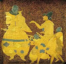 ![]() Desenho em Suzuri-bako de estilo Rimpa da década de 1590. Possivelmente representa Yasuke à esquerda, em vestes portuguesas de alta classe e não subserviente aos outros homens da pintura[1] | |