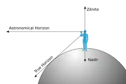 - Na astronomia, zênite e nadir definem um dos eixos do Sistema horizontal de coordenadas, nele a altura de um objeto é medida, em graus, a partir do horizonte até a linha imediatamente acima do observador, logo a altura do zênite corresponde sempre a 90° e portanto integrada aos pontos cardeais.