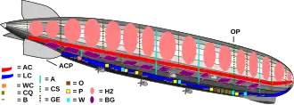 Os Zeppelins possuíam um sistema de propulsão constituído por vários motores, montados em gôndolas ou em naceles, as quais eram atadas à parte externa da estrutura. Alguns deles possuíam impulso assimétrico, utilizado para manobras. Possuíam também um compartimento comparativamente pequeno para passageiros e tripulantes, localizado na parte inferior da estrutura, entretanto nos Zeppelins mais modernos esse não era todo o espaço habitável; passageiros ou cargas eram frequentemente transportados internamente por razões aerodinâmicas.