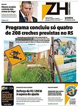 Zero Hora é um jornal brasileiro de circulação diária, com base em Porto Alegre, Rio Grande do Sul. O jornal foi fundado em 1964 por Ary Carvalho e é controlado pelo Grupo RBS. É considerado um dos principais jornais de referência do Brasil,[4][5] ao lado de outros jornais como Folha de S.Paulo, Estado de Minas, O Globo, Correio Braziliense e O Estado de S. Paulo.