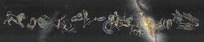Chama-se de zodíaco o conjunto de constelações ao longo da eclíptica (o caminho aparente percorrido pelo Sol durante o ano). As 13 constelações que compõem o zodíaco, pela divisão feita pela União Astronômica Internacional em 1930, são:[42][43]