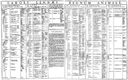 Seguindo a divisão proposta por Carolus Linnaeus, o reino animal é um dos cinco reinos, sendo subdividido principalmente nos seguintes filos: poríferos, cnidários, platelmintos, nematelmintos, anelídeos, moluscos, artrópodes, equinodermos, e cordados: peixes, répteis, anfíbios, aves e mamíferos — animais com corda dorsal.